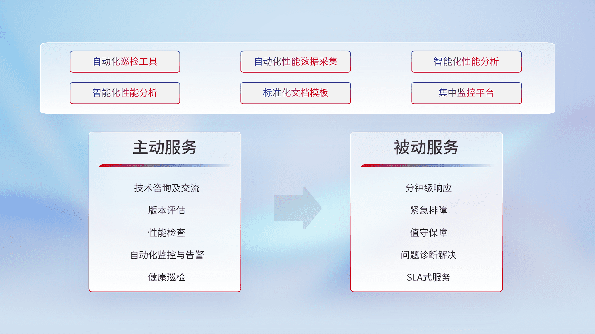 智能化工具和标准化文档,,保障服务质量,,,提供主动服务(包含技术咨询、、、版本评估、、、、性能检查、、、自动化监控与告警、、、、健康巡检)和被动服务包含(分钟级响应、、、、紧急排障、、值守保障、、、、问题诊断解决、、、、SLA服务)。。。